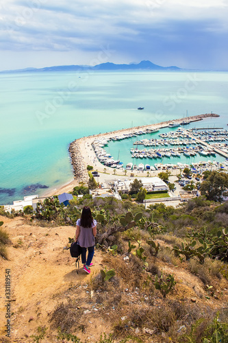 Young woman looking at panoramic view of seaside in Sidi Bou Said, Tunisia, North Africa