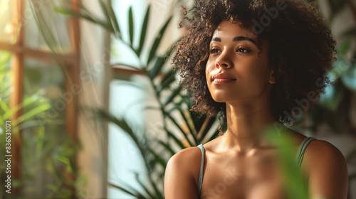 Young woman looking thoughtfully out a window, surrounded by plants.
