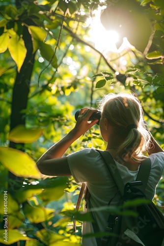 Young woman looking through binoculars in the forest. Birdwatching, zoology, ecology. Ornithology, research in nature, observation of birds. Adventure and exploration concept