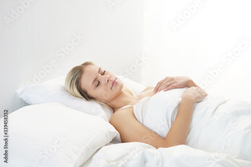 Young woman lying in the bed. Beautiful blond sleeping girl. Morning in the bedroom, daylight from the window. Health and rest.