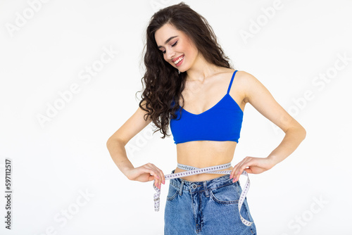 Young woman measuring her waist isolated on white background