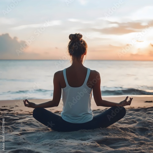 Young Woman Meditating in a Yoga Pose at the Beach at Sunset or Sunrise, AI