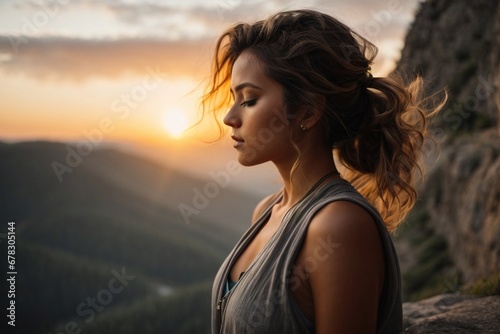 Young woman meditating on a cliff overlooking a mountain landscape, outdoor relaxation for mental wellbeing, generative AI