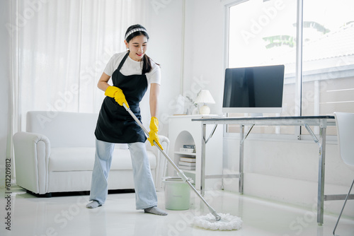 young woman mopping the floor cleaning at home smiling cheerful.cleaning staff cleaning concept