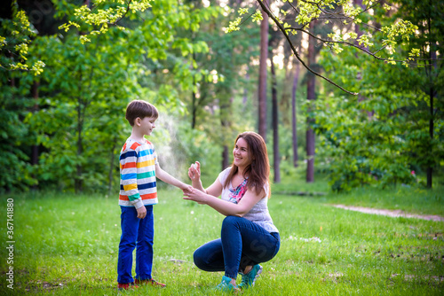 Young woman mother applying insect repellent to her son before forest hike beautiful summer day or evening. Protecting children from biting insects at summer. Active leisure with kids.