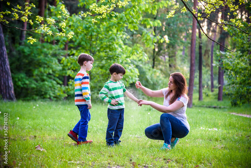 Young woman mother applying insect repellent to her two son before forest hike beautiful summer day or evening. Protecting children from biting insects at summer. Active leisure with kids