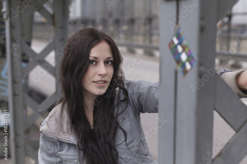 Young woman on Hacker Bridge, Munich, Bavaria, Germany
