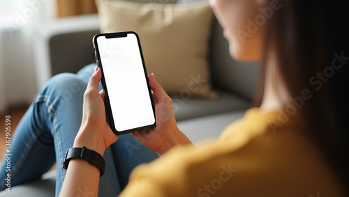 Young Woman on Sofa Using Smartphone Mockup for Mobile Shopping, Social Media, and Food Delivery - Over the Shoulder View with White Screen and Empty Space for Text