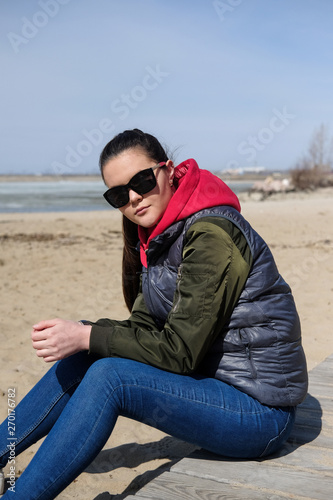 Young woman on the beach in warm clothes. A girl in a red hoodie wears a hood over her head.