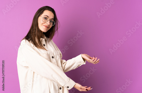 Young woman over isolated purple background extending hands to the side for inviting to come