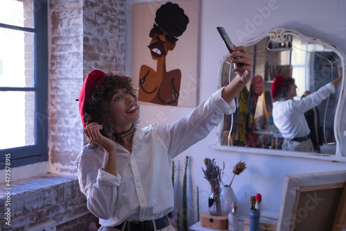 Young woman, painter, designer and artist with a red beret, taking a selfie with her cell phone inside her studio. Concept photo, photography, selfie, mobile phone.