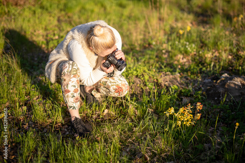 young woman photographs flowers in the meadow, spending free time, relaxing in the bosom of nature, amateur photography