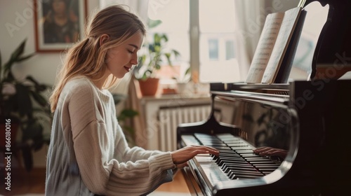 Young woman playing the piano at home. A female smiling expression while enjoying the music. A concept for musical education or relaxation in the living room.