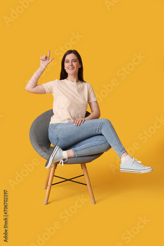 Young woman pointing at something in armchair on yellow background
