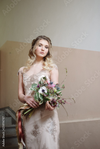 Young woman posing in a light long lace dress with a bouquet of flowers in her hands
