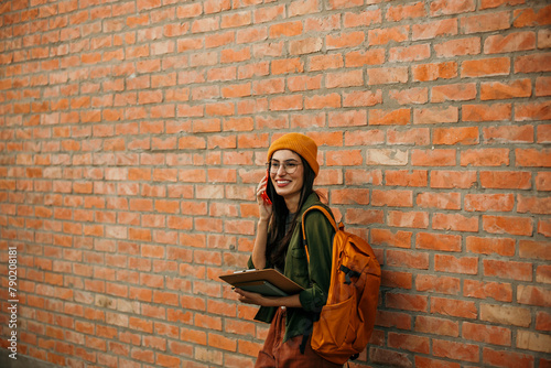 Young woman posing with books in hand, holding a phone and showcasing her academic determination on campus grounds