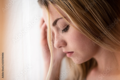 Young woman posing with eyes closed, closeup shot.
