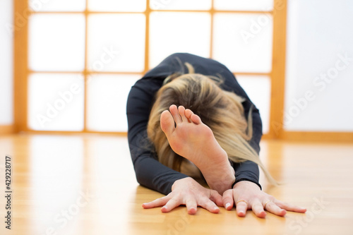 Young woman practicing yoga in a Japanese style room