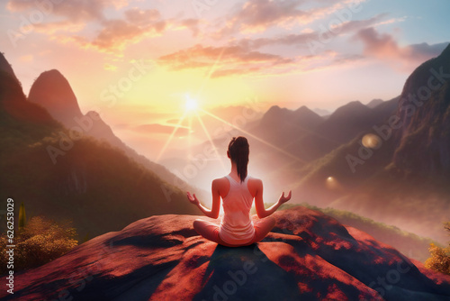 Young woman practicing yoga in mountains at sunset. Harmony, meditation, healthy lifestyle, relaxation. Generative Ai content