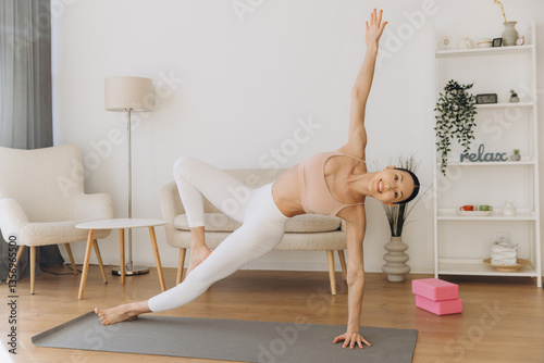Young woman practicing yoga side plank pose at home