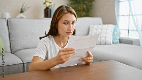 Young woman reading document sitting on floor at home