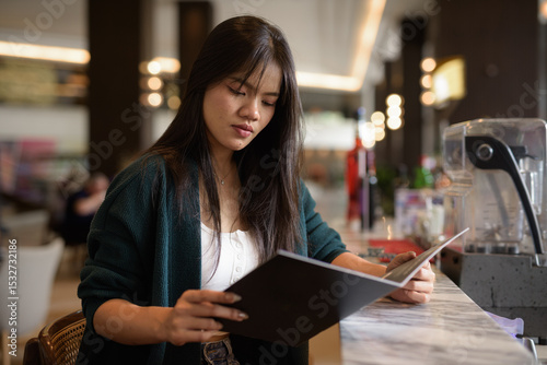 young woman reading menu in restaurant bar