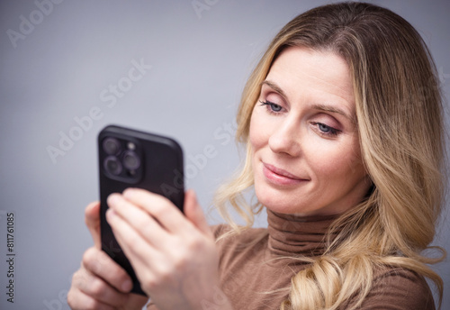 young woman reading on social networks, typing text or shopping online. Mobile phone in the hands of a girl.
