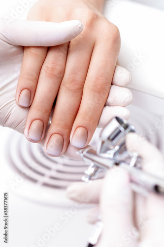 Young woman receiving manicure by airbrush in nail salon. Procedure for spraying paint on the nails