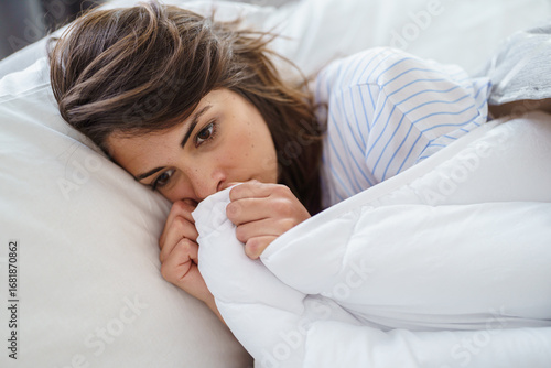 Young Woman Resting on a Comfortable Couch at Home with a Calm and Thoughtful Expression