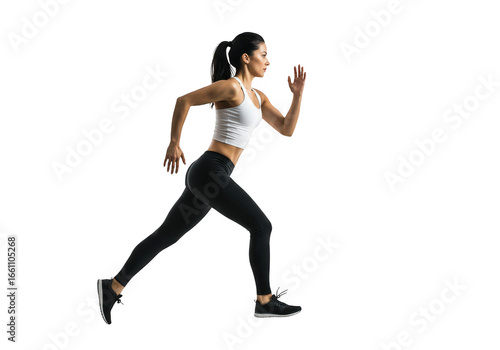 Young woman running and exercising, isolated on transparent background