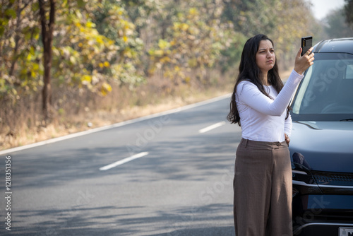 Young woman searching for a mobile network in the forest with her damaged car, bad connection and no signal concept image