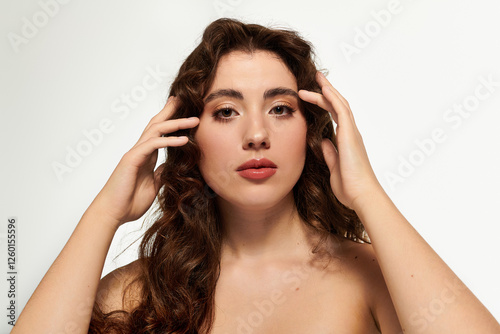 Young woman showcasing modern beauty with flowing hair and expressive hands in a clean backdrop