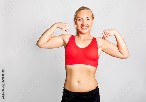 Young woman showing biceps