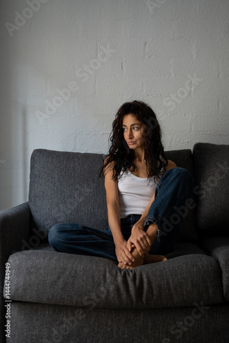 Young woman sitting barefoot on dark grey sofa in casual homewear, looking away in natural light, peaceful mood and cozy minimalist interior.v