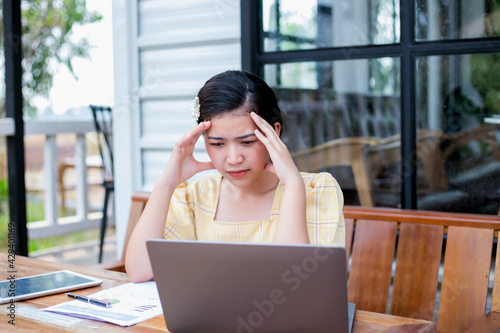 Young woman sitting in a cafe with her laptop, Stressful for work.