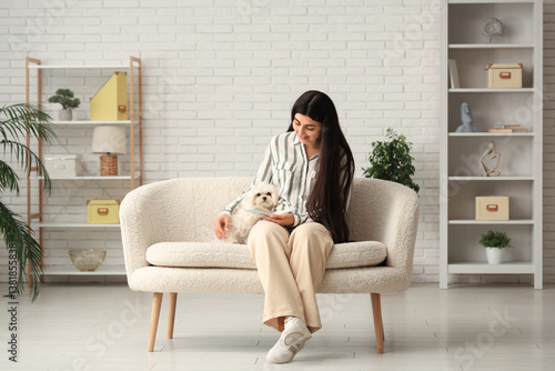 Young woman sitting on sofa with her white Bolognese dog and notebook in stylish office