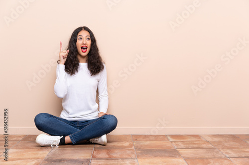 Young woman sitting on the floor intending to realizes the solution while lifting a finger up