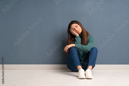 Young woman sitting on the floor making sleep gesture in dorable expression