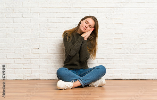 Young woman sitting on the floor making sleep gesture in dorable expression