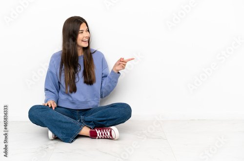 Young woman sitting on the floor pointing finger to the side and presenting a product