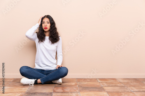 Young woman sitting on the floor with an expression of frustration and not understanding