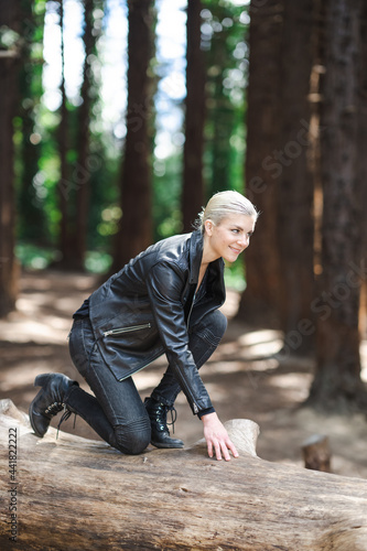 Young Woman Sitting or Standing on Fallen Tree in a Redwood Grove