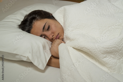 young woman sleeping in white bed