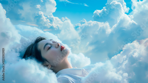 Young woman sleeping on a up in the clouds and a blue sky