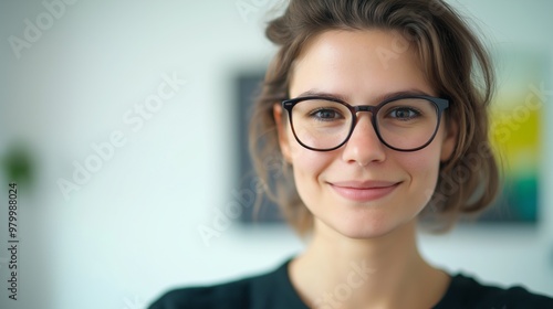 Young woman smiles in glasses indoors, radiating confidence and happiness in a modern, professional setting
