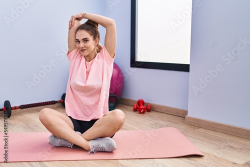 Young woman smiling confident stretching arms at sport center