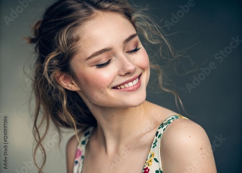 Young woman smiling, long wavy hair, natural makeup, floral strap top, soft lighting, warm tones, dreamy atmosphere, portrait, close-up, candid expression, joyful mood, golden hour glow