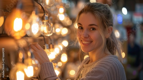Young Woman Smiling with Warm Lights in the Background.
