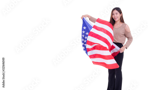 Young woman standing and showing the American flag with white background. Space for Text. 4th of July. Celebrate American National Day. Labor Day. Independence Day