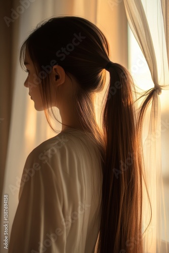 Young woman standing by a window with sunlight filtering through sheer curtains, showcasing long hair, reflective mood, relaxed interior atmosphere.